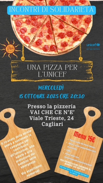 Si è svolto con grande partecipazione l’evento di solidarietà “Una Pizza per l’UNICEF”, promosso dal Comitato Provinciale UNICEF di Cagliari e ospitato mercoledì 15 ottobre presso la pizzeria Vai che c’è ne, in viale Trieste a Cagliari.