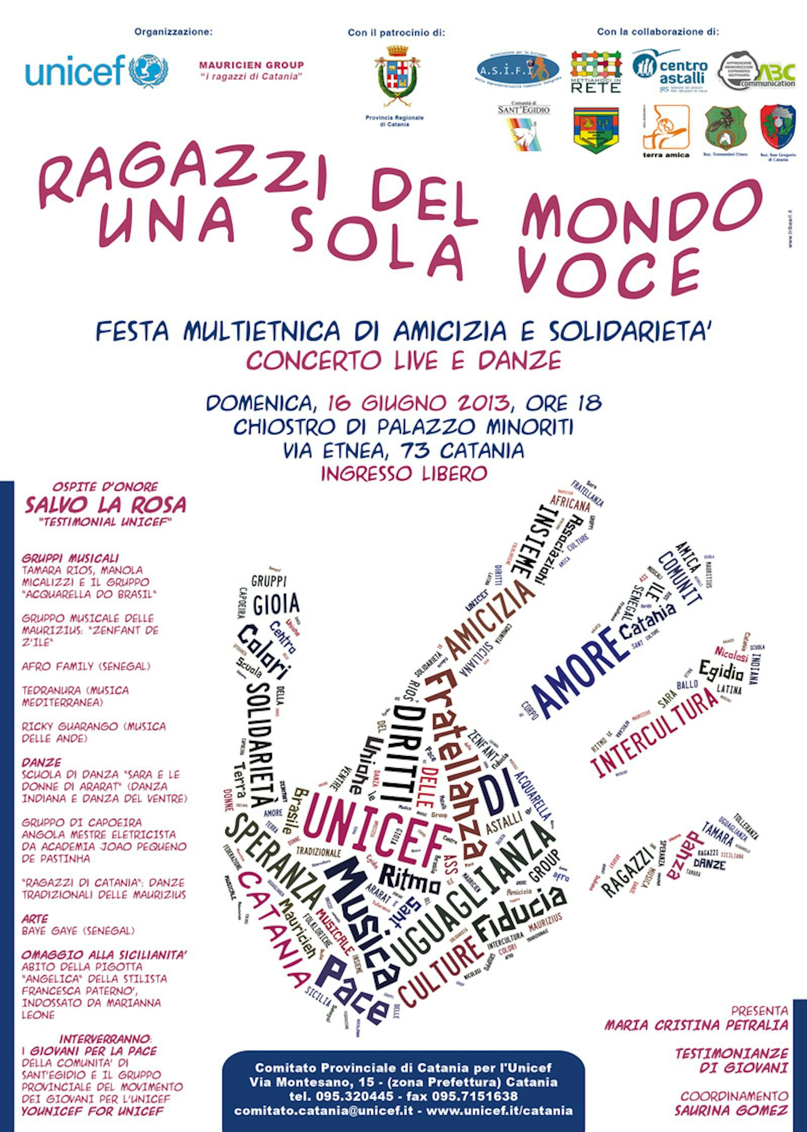 La manifestazione è stata promossa dal Comitato Provinciale di Catania per l’UNICEF, con il patrocinio della Provincia Regionale, in partnership con il Mauricien Group, presieduto da Daven Veeramah che non a caso ha dato vita all' associazione Ragazzi di Catania. L’ iniziativa, che ha coinvolto catanesi e turisti, è stata egregiamente coordinata da Saurina Gòmez, venezuelana, mediatrice culturale e, per incarico del Presidente Provinciale del Comitato Provinciale per l'UNICEF, Vincenzo Lorefice, responsabile per la promozione e mediazione interculturale con le istituzioni e i privati.