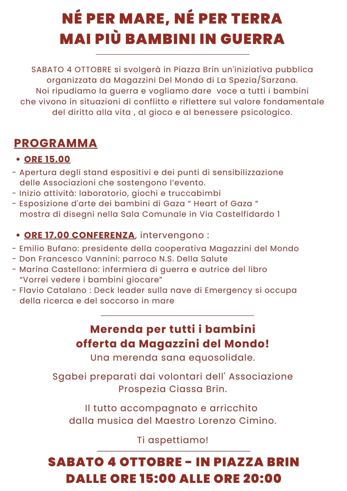 Sabato 4 ottobre p.v dalle ore 15 alle ore 20 in Piazza B.Brin si svolgerà, organizzato da “Magazzini del mondo” di La Spezia/ Sarzana, l’evento, patrocinato dal Comune della Spezia,