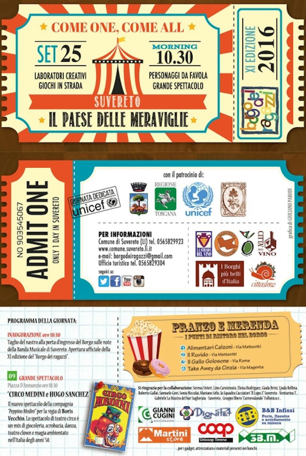 I bambini trasformeranno le vie e le piazze del centro storico di Suvereto, chiuso al traffico, in spazi d’incontro, di divertimento e di serenità; tante attività che si svolgono all’interno del borgo fino a raggiungere la rocca aldobrandesca: pitture, storie, mestieri, arte circense, giochi, ma soprattutto laboratori.