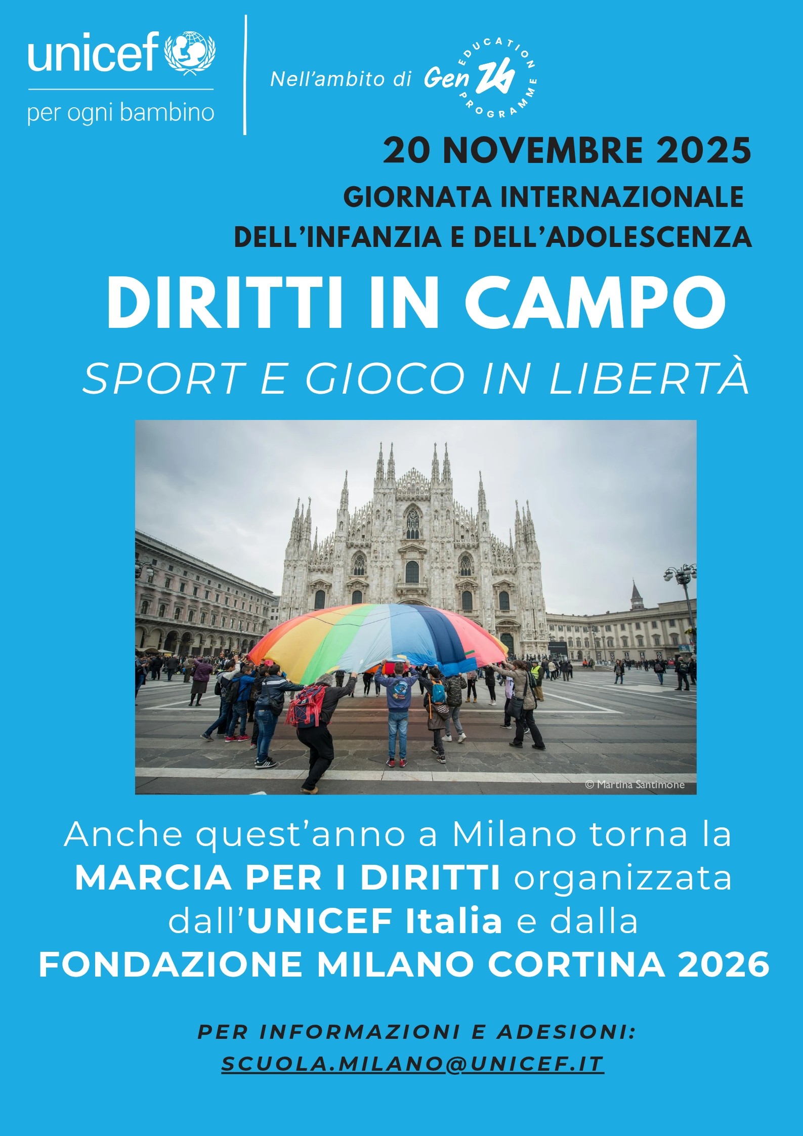 Giovedì 20 novembre bambine, bambini e adolescenti delle scuole marceranno per le vie di Milano per celebrare la Giornata Internazionale dei diritti dell’Infanzia e dell’Adolescenza, una giornata quest’anno all’insegna del tema “DIRITTI IN CAMPO. SPORT E GIOCO IN LIBERTÀ !”.