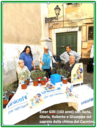 Sabato 27 settembre e Domenica 28, tante giovani piantine di olivo sono state esposte sui banchini Unicef in tutta Italia. Nella provincia di Pisa sono stati realizzati banchini a San Giovanni alla Vena, presso lo studio di una volontaria Unicef, Elena; a Uliveto, presso il frantoio (entrambe sono frazioni del comune di Vicopisano) e a Pisa, in prossimità della chiesa dei Santi Cosimo e Damiano nel quartiere di San Marco, grazie al parroco Don Paulo. Un altro banchino è stato allestito sul sagrato della Chiesa di Santa Maria del Carmine dei frati Carmelitani, grazie a padre Paolo che ci ha sostenuto e ha anche acconsentito di essere presente in uno scatto fotografico insieme con due volontari Unicef, Rita e Roberto. Questo banchino ha avuto anche una madrina di eccezione, Ester Gilli di 102 anni, nella foto insieme con Ilaria, Gloria, Roberto e Giuseppe!