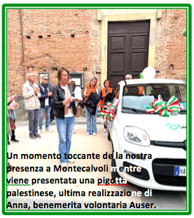 La campagna Unicef con le piantine di olivo si è prolungata fino alla Festa dei Nonni del 2 ottobre e alla bella Festa dell’associazione AUSER il 4 ottobre a Montecalvoli (Santa Maria a Monte). Lì, al banchino Unicef, erano Silvana e Maria Antonietta, mentre si commemorava una benemerita volontaria Auser, Anna, a cui veniva dedicata un nuovo mezzo di soccorso, alla presenza del Sindaco Manuela del Grande e del Presidente del Consiglio Regionale Antonio Mazzeo. Nell’occasione la figlia di Anna ha mostrato con orgoglio una curatissima Pigotta Palestinese realizzata dalla madre, da conservare ed esibire come simbolo prezioso dell’attività per l’Unicef e, ad un tempo, del valore del popolo palestinese.