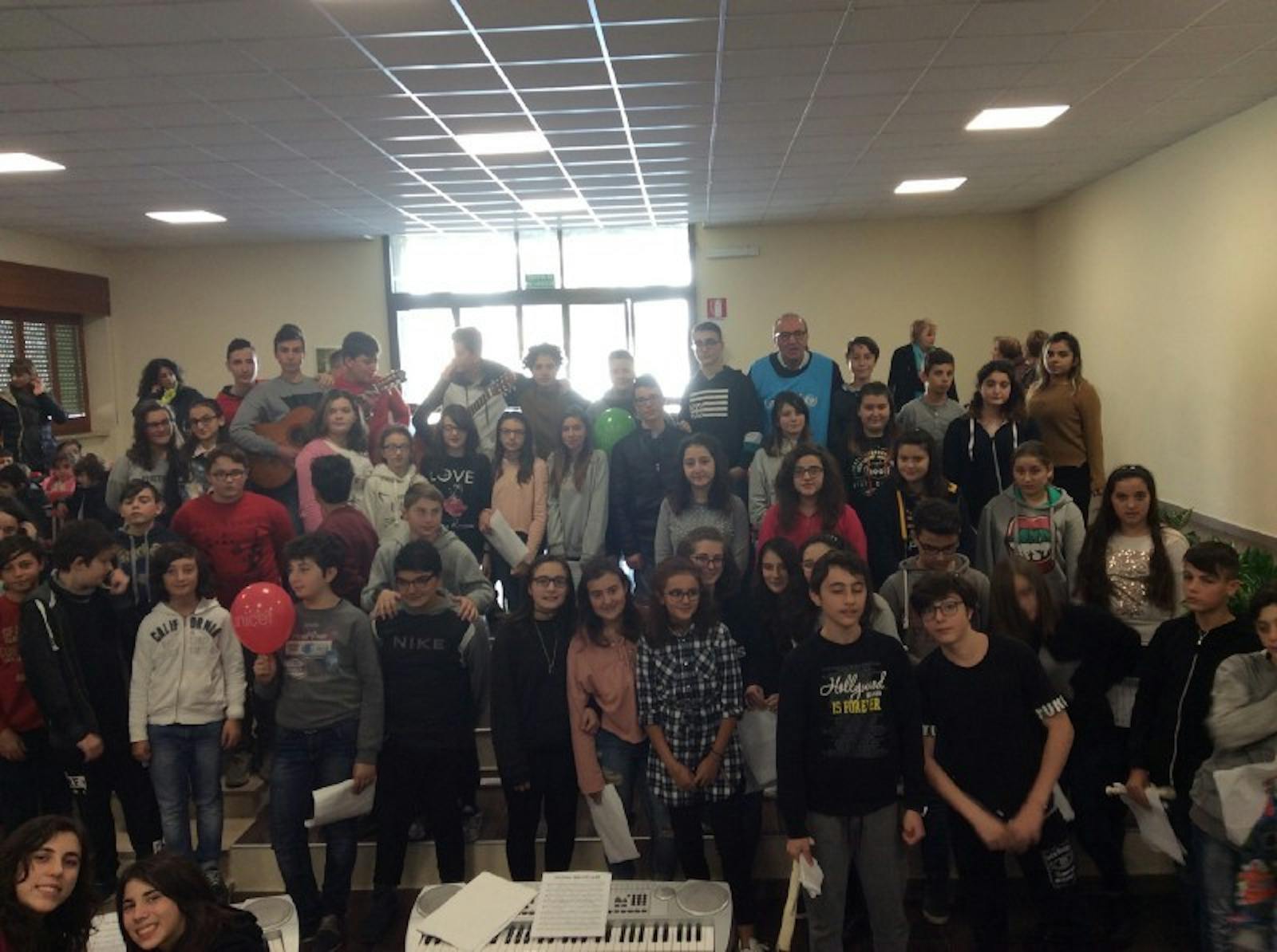 La docente di educazione musicale Maria Antonietta Santangelo, con due canzoni “On ecrit sur le murs” e “ We are the world”, suonate e cantate dalle seconde e terze della scuola media , dà inizio alla festa.