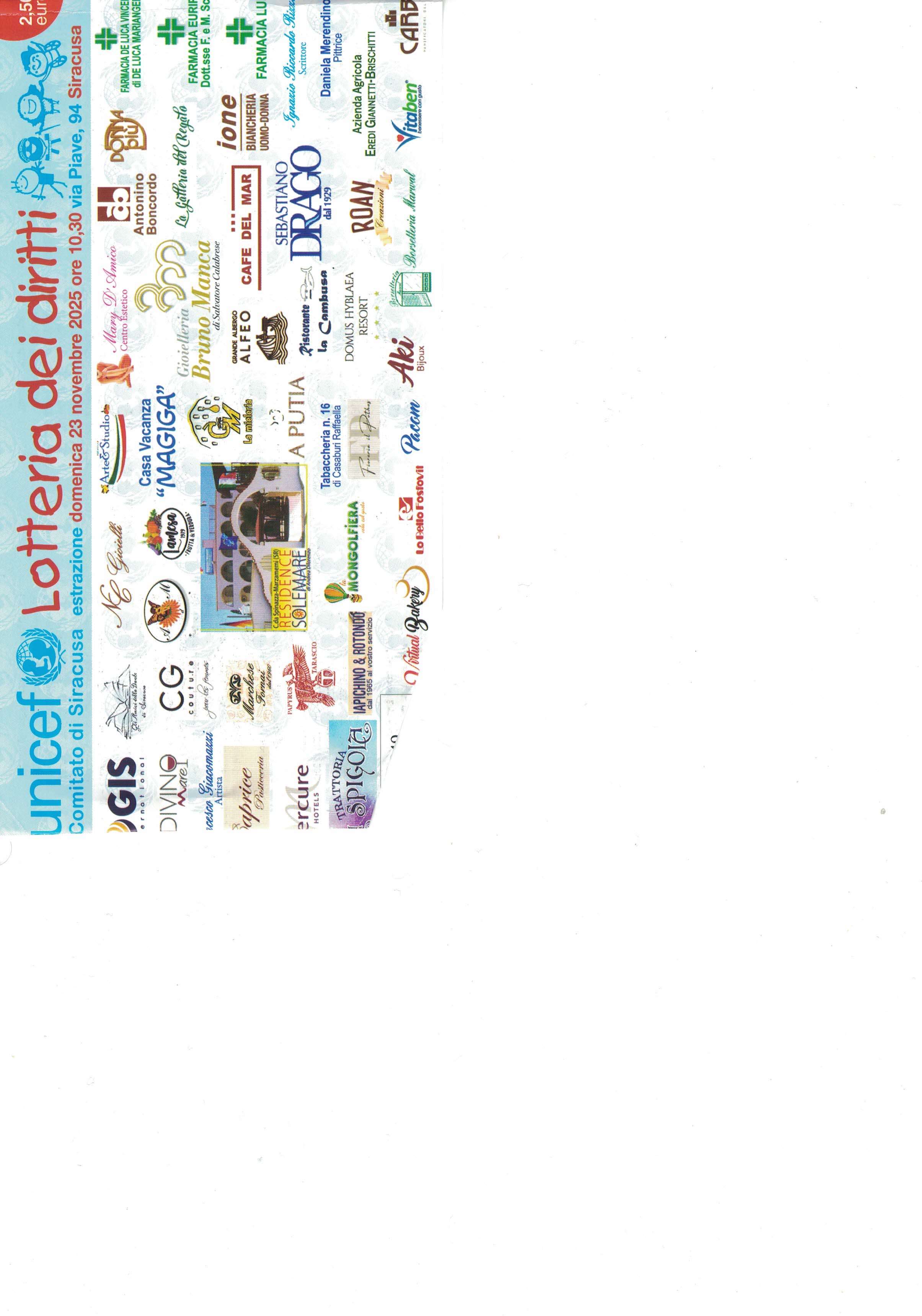 Domenica 23 novembre 2025, dalle ore 10:30, nei locali del Comitato Provinciale UNICEF di Siracusa in Via Piave, 94, alla presenza della Dott.ssa Daniela Di Stefano, incaricata del Sindaco del comune di Siracusa, con la collaborazione del Dott. Alessandro Drago e della Dott.ssa Valeria Cassia, rispettivamente Presidente e Segretaria del Comitato Provinciale Unicef di Siracusa, si è tenuta l’Estrazione dei Premi della “Lotteria dei Diritti 2025” UNICEF di Siracusa.
