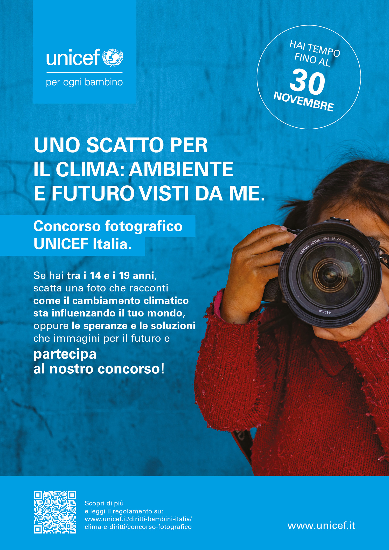 Per tenere alta l’attenzione sul tema del cambiamento climatico, l’UNICEF Italia, nell’ambito della campagna “Cambiamo Aria”, ha lanciato il concorso fotografico “Uno scatto per il clima: ambiente e futuro visti da me” rivolto a ragazze e ragazzi di età compresa tra i 14 e i 19 anni. Tutte le informazioni per partecipare, compresi regolamento e privacy, sono disponibili sulla pagina: https://www.unicef.it/diritti-bambini-italia/clima-e-diritti/concorso-fotografico/