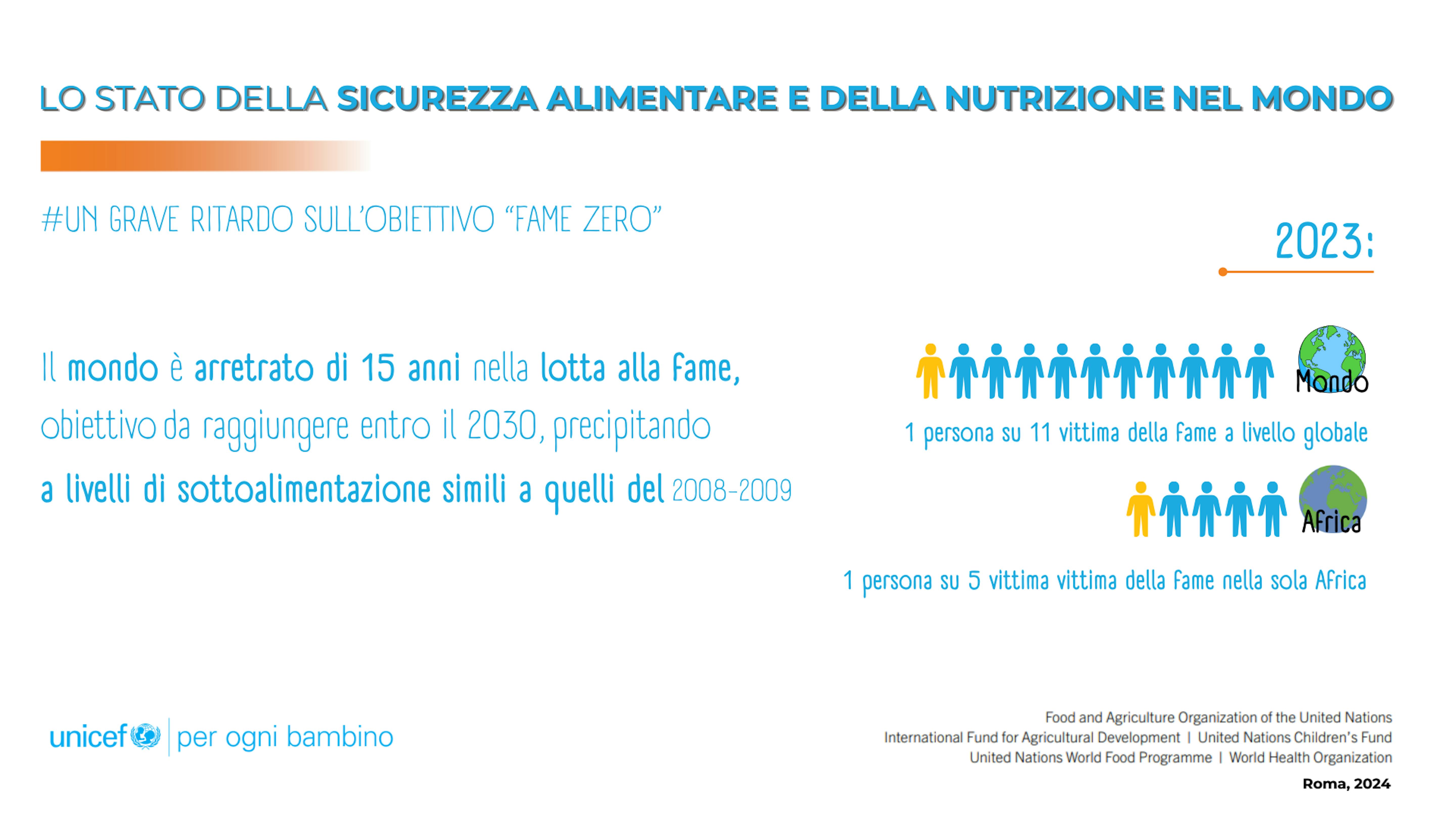 Nella prefazione del rapporto, i capi delle cinque agenzie delle Nazioni Unite, ossia il Direttore Generale della FAO, QU Dongyu; il Presidente dell’IFAD, Alvaro Lario; la Direttrice Esecutiva dell’UNICEF, Catherine Russell; la Direttrice Esecutiva del PAM, Cindy McCain, e il Direttore Generale dell’OMS, il dott. Tedros Adhanom Ghebreyesus, scrivono quanto segue: “Stimare il divario nei finanziamenti per la sicurezza alimentare e la nutrizione e ricorrere a modalità di finanziamento innovative per colmare tale divario devono essere le nostre principali priorità. Le politiche, le norme e gli interventi proposti per eliminare la fame e garantire a tutte le persone l’accesso a cibo sicuro, nutriente e sufficiente (Obiettivo 2.1) e per porre fine a tutte le forme di malnutrizione (Obiettivo 2.2) richiedono una mobilitazione ingente di risorse. Non rappresentano soltanto un investimento per il futuro, ma sono anche un nostro dovere. Ci impegniamo a garantire il diritto a un’alimentazione e a una nutrizione adeguate per le generazioni attuali e future”.