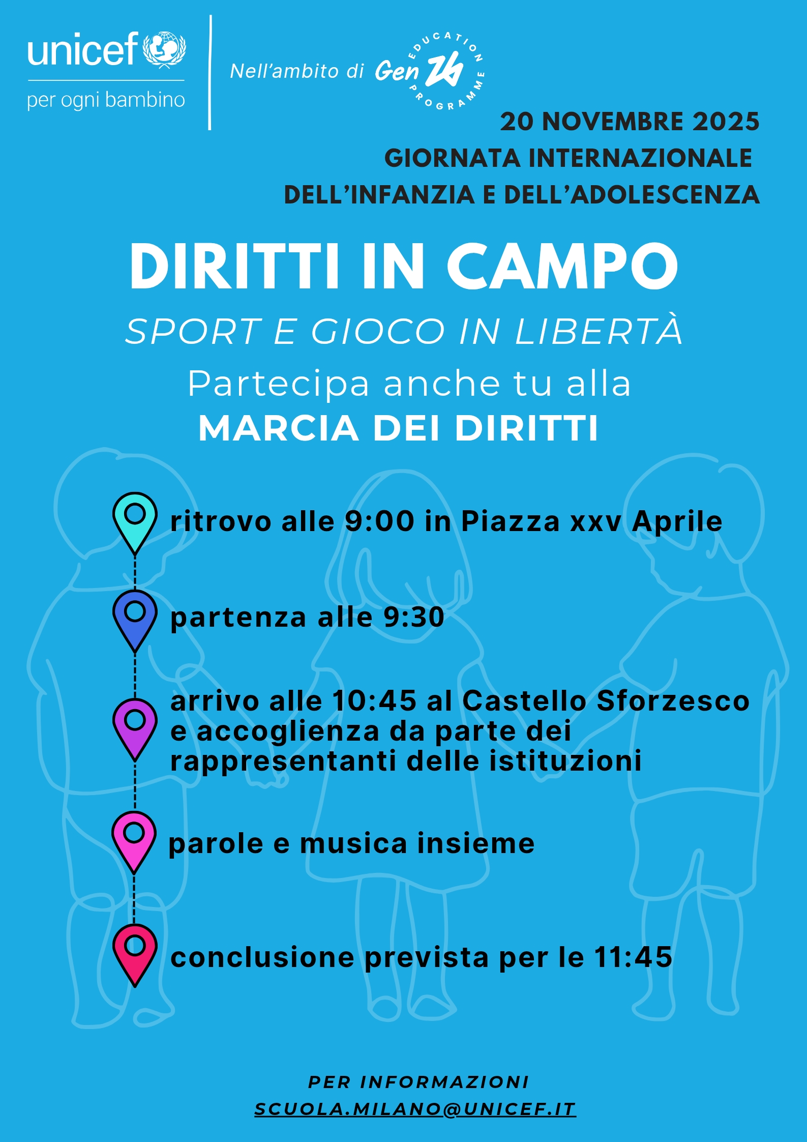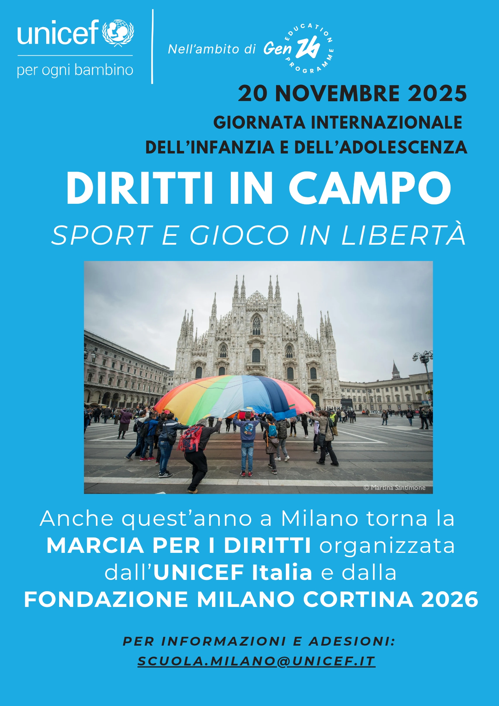 L’UNICEF Italia celebra il 20 novembre, Giornata Mondiale dell’Infanzia e dell’Adolescenza, con la Marcia dei Diritti di Milano, organizzata quest’anno nell’ambito del Programma Education Gen26 della Fondazione Milano Cortina 2026, con lo slogan “Diritti in campo, sport e gioco in libertà”.